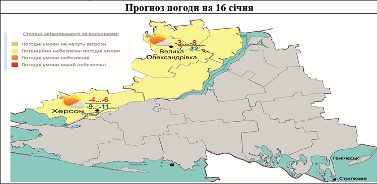 16 січня 2026 року по Херсонській області та по м. Херсону: На дорогах ожеледиця (І рівень небезпечності-жовтий).