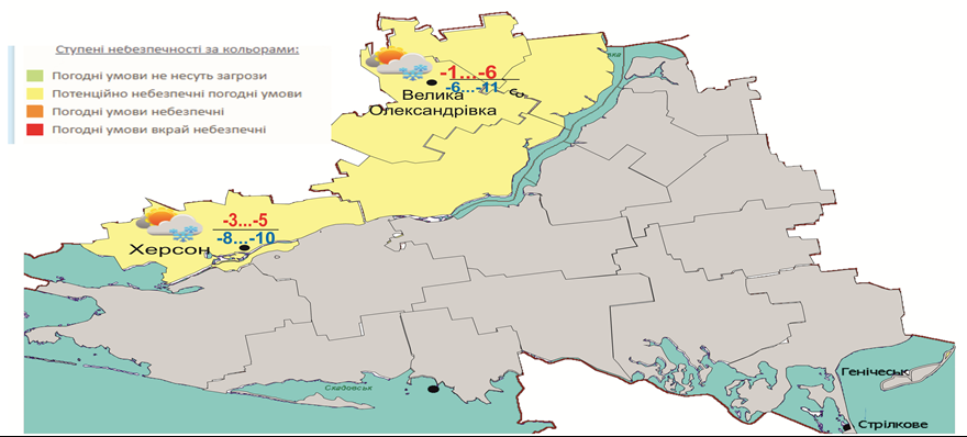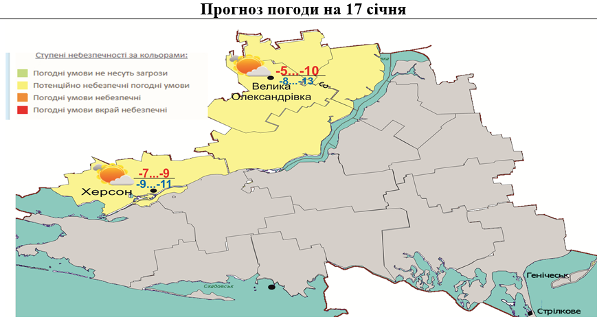 17 січня 2026 року по Херсонській області та по м. Херсону: На дорогах ожеледиця (І рівень небезпечності-жовтий).