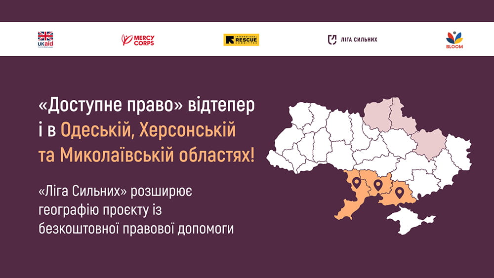 «Ми розширюємо географію проєкту «Доступне право», тому що бачимо реальний запит людей на безкоштовну й зрозумілу правову допомогу. Відтепер проєкт працюватиме і на Херсонщині. Це дасть змогу ще більшій кількості людей отримати консультації з важливих правових питань — швидко, безкоштовно та без страху залишитися сам на сам зі своєю проблемою. Для нас принципово, щоб право було доступним, незалежно від місця проживання», — пояснює виконавча директорка «Ліги Сильних» Дар’я Кукуріка.
